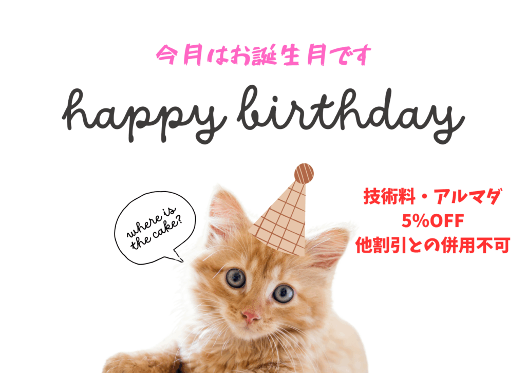 11月生まれのお客様へのクーポン 11月生まれのお客様は、こちらのバースデイカードをスマホ提示されますと 技術料・・・・・・5%OFFアルマダ商品・・・5%OFF となりま...