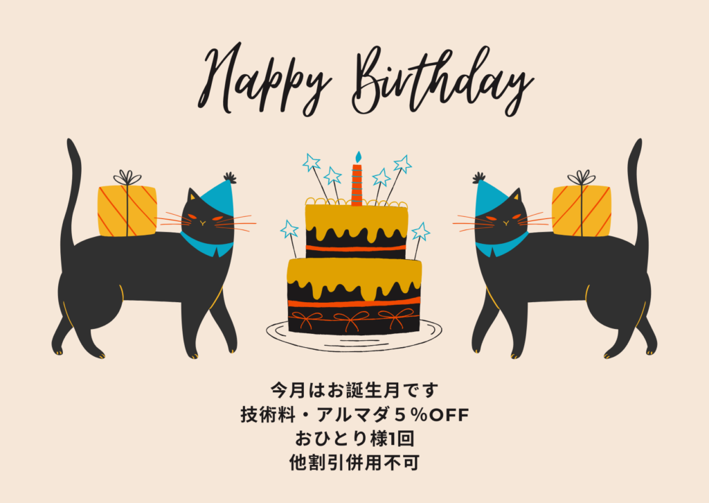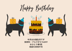 1月に誕生日を迎える貴女へ 1月生まれのお客様へのクーポン 1月生まれのお客様は、こちらのバースデイカードをスマホ提示されますと 技術料・・・・・・5%OFFアルマダ商品・・・5%OFF となります...