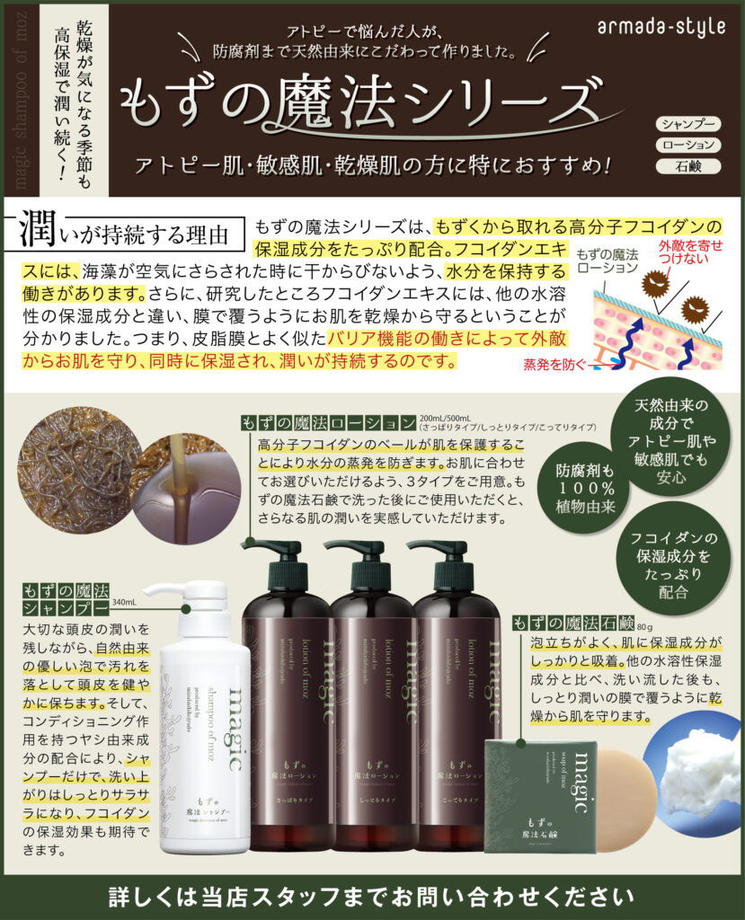 アトピーで悩んだ人がこだわりぬいて作ったもずくから出来たスキンケア商品 2013年モンドセレクション受賞商品「もずの魔法シリーズ」 もずの魔法ローション銀賞受賞 も...